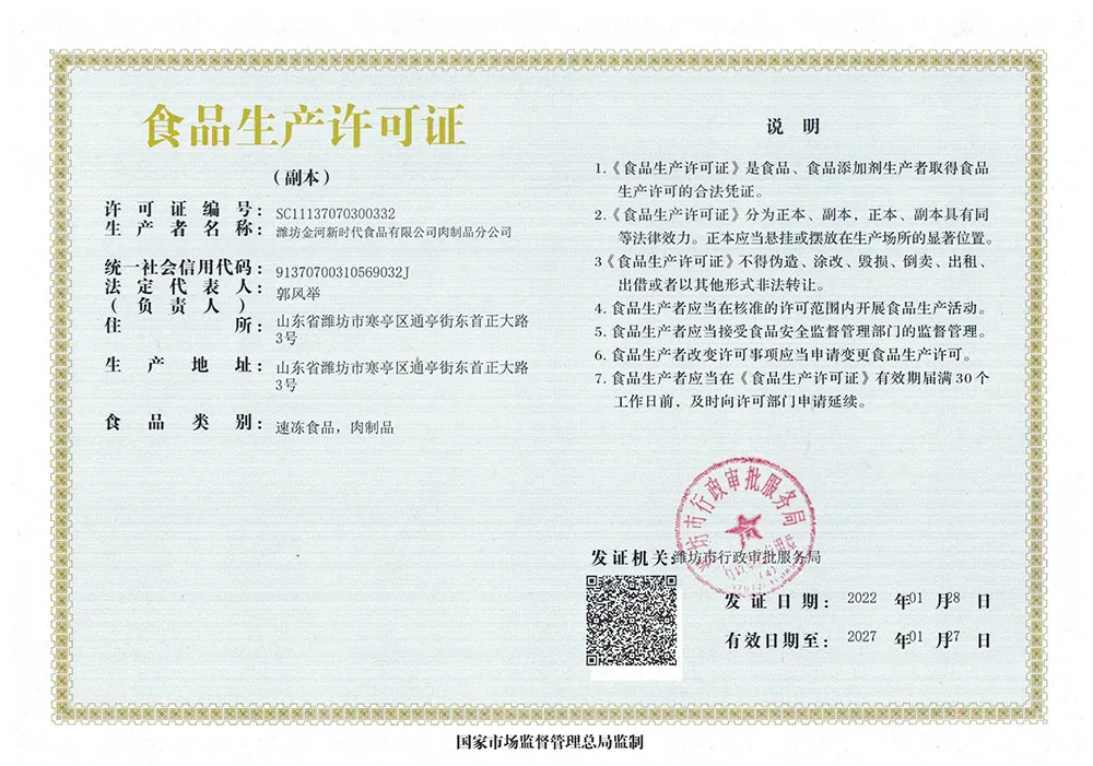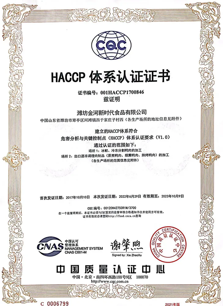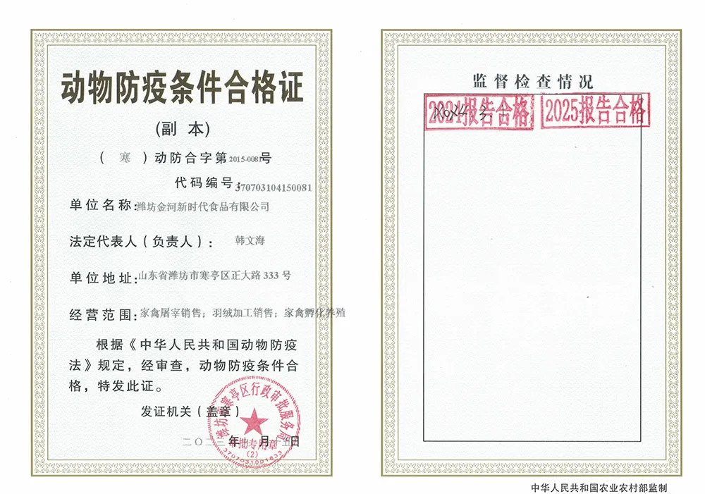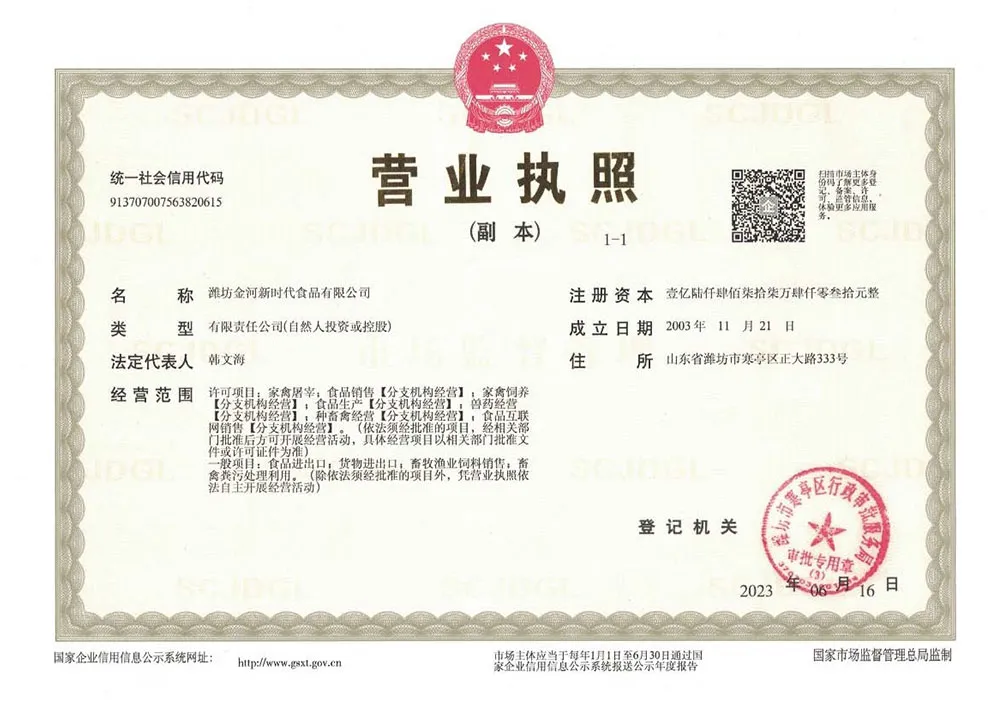 ООО Вэйфан Цзиньхэ Новая Эра по Пищевой Продукции было основано в 2003 году с уставным капиталом 164 674 030 юаней. Компания работает как интегрированное предприятие с полной производственной цепочкой, включая разведение и инкубацию птицы, коммерческое выращивание уток, забой и переработку мясных уток, производство готовых мясных продуктов, продажу продукции и экспортную торговлю. Компания управляет одним дочерним предприятием по разведению уток, девятнадцатью фермами по разведению мясных уток, одним заводом по убою и переработке мясных уток, одним заводом по переработке утиного мяса и одним заводом по переработке готовых продуктов питания. Ее производственные мощности по разведению уток составляют 500 000 голов, а годовой объем производства — 47 миллионов утят. Холодильный завод имеет суточную мощность по убою 80 000 уток, перерабатывает 70 000 тонн продуктов из утиного мяса в год и имеет экспортную мощность почти 20 000 тонн продуктов из переработанного утиного мяса в год.