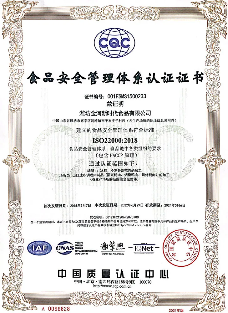 Компания последовательно получила сертификаты системы управления безопасностью пищевых продуктов ISO 22000, глобального стандарта BRC для розничной торговли, международного стандарта IFS для пищевых продуктов и системы управления безопасностью пищевых продуктов HACCP. Она зарегистрирована в Японии, Европейском союзе и Южной Корее (таможенная регистрация № 3700/03431), а регистрация в Сингапуре, Австралии, Канаде и США находится в процессе. Завод по переработке продукции компании получил сертификат SC.